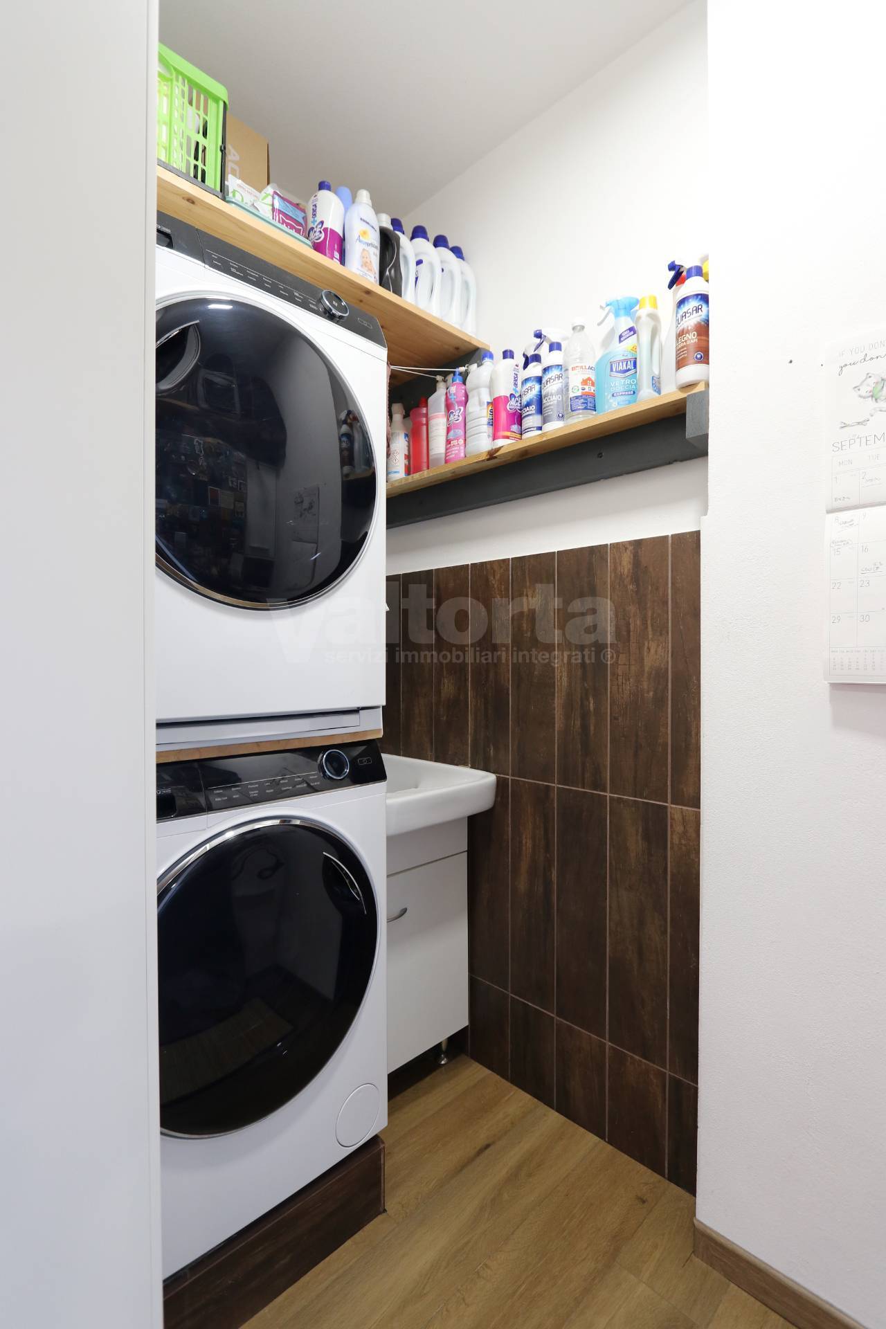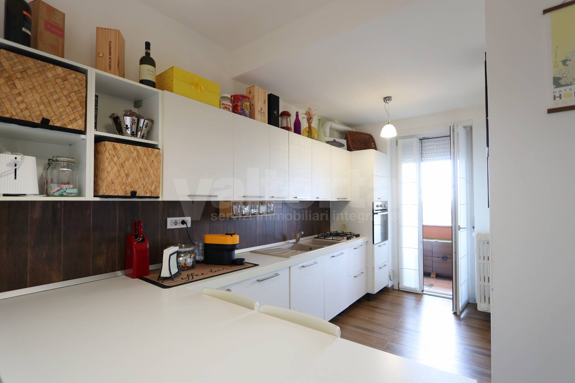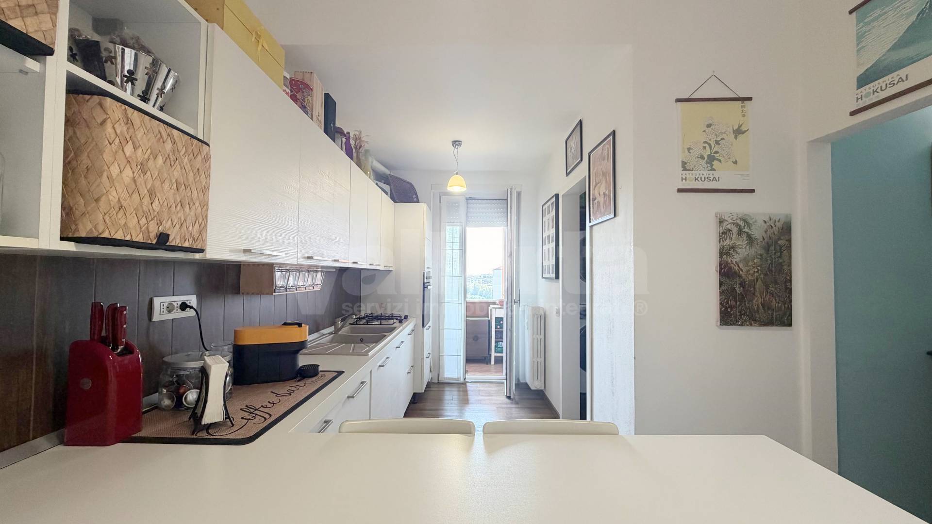 La cucina, abitabile e luminosa, è servita da un balcone e da una pratica lavanderia separata. Oltre che uno spazio adibito a ripostiglio nell’ingresso.