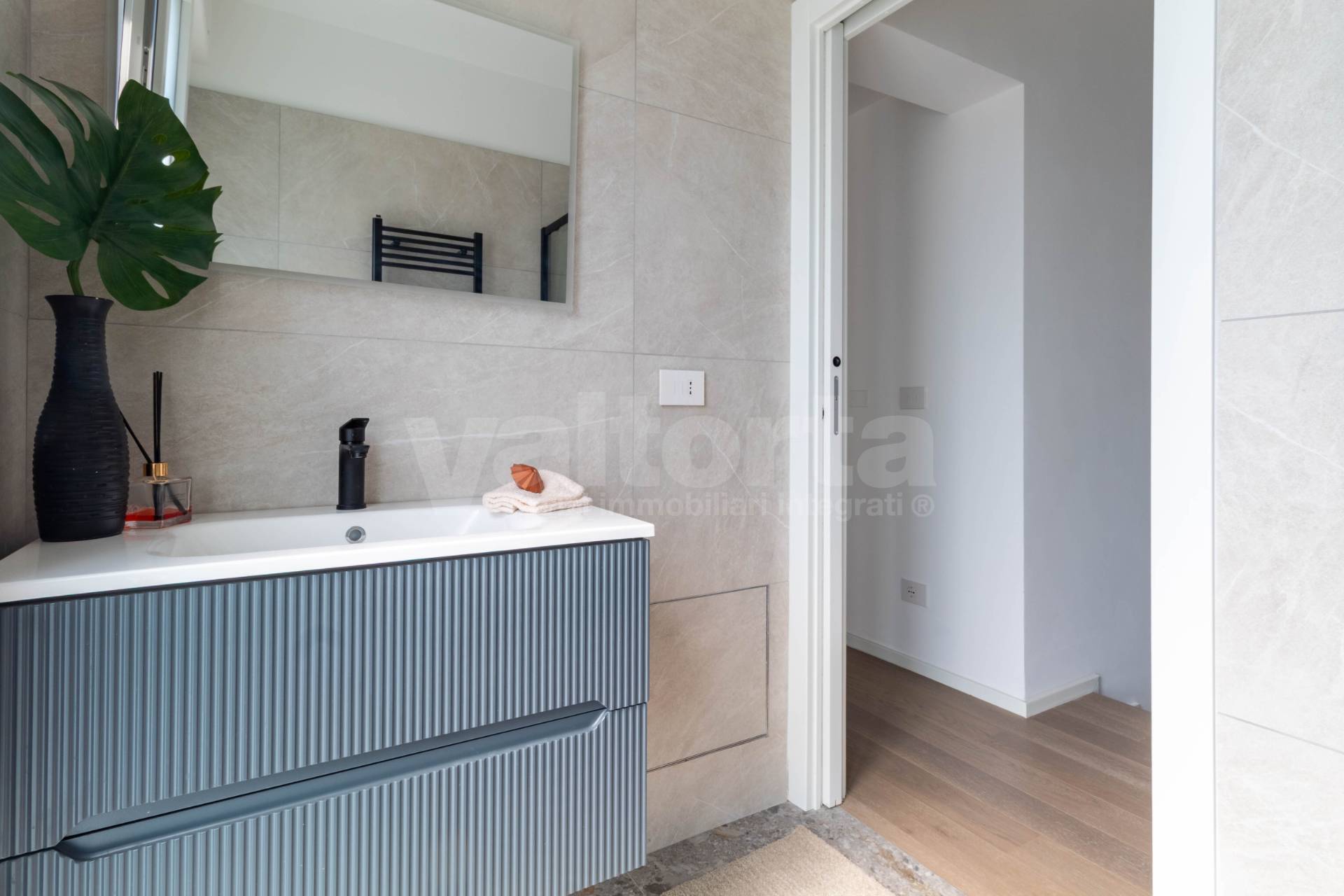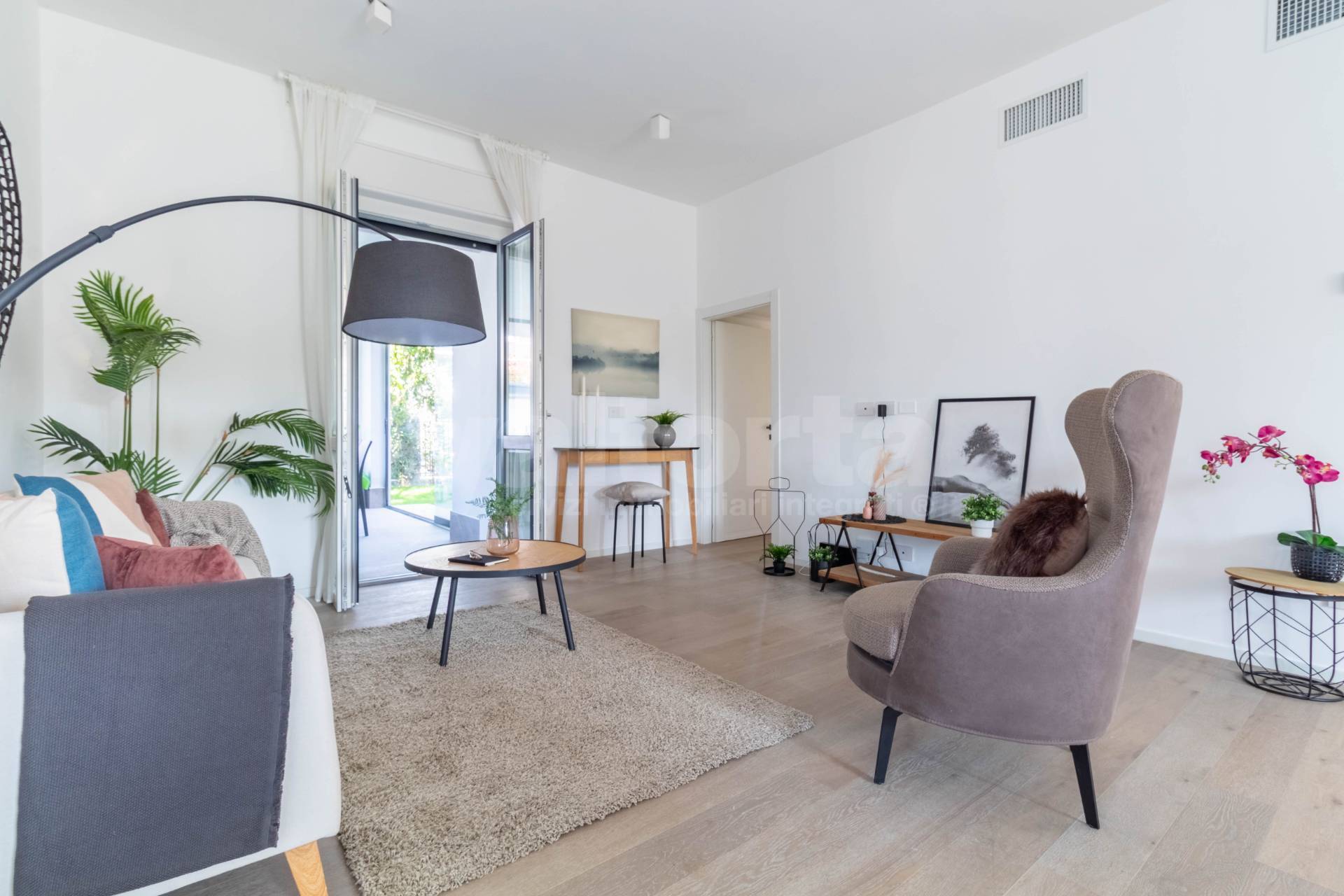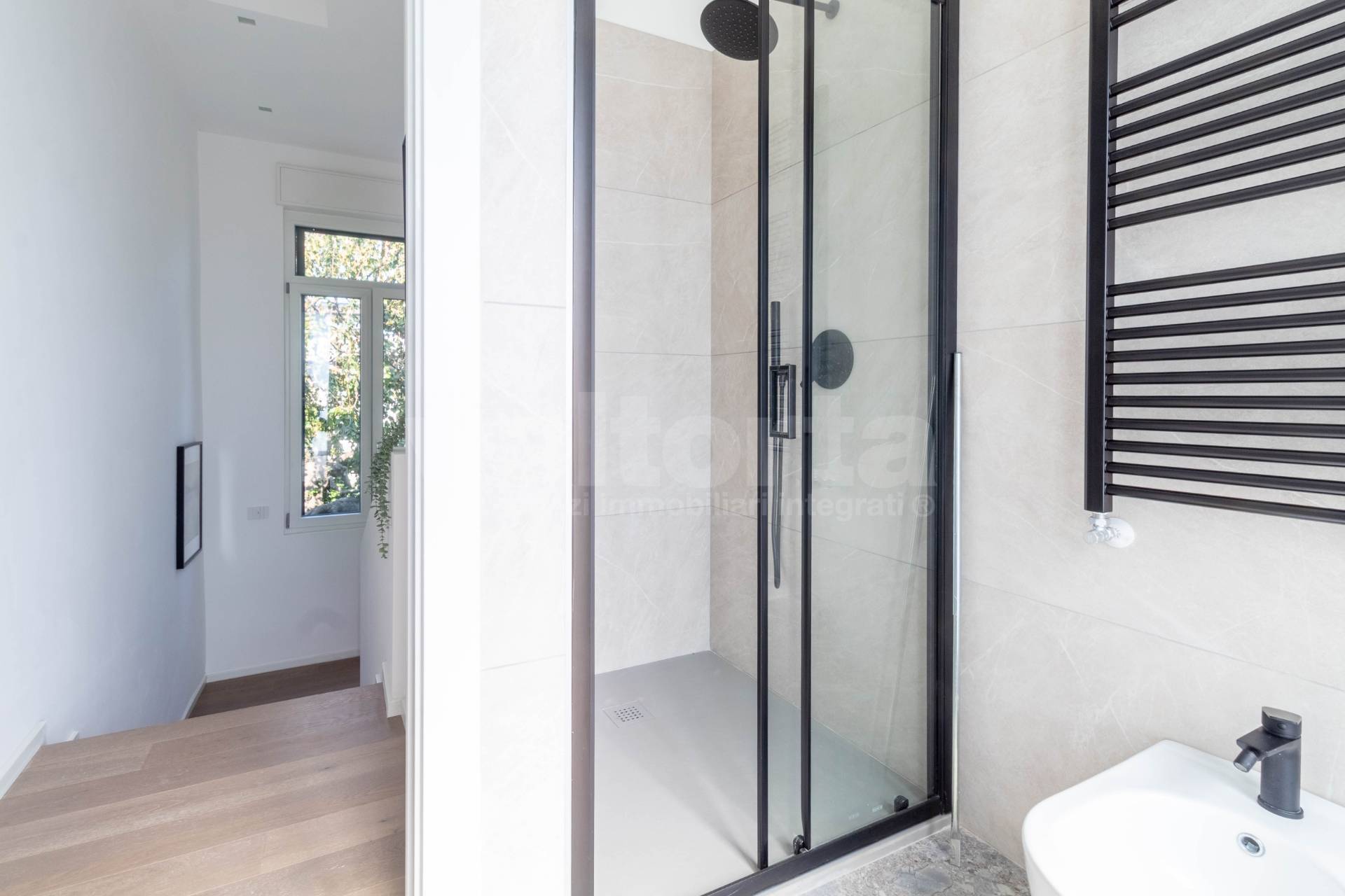 Al piano d’ingresso, l’immobile presenta un’ampia zona living con cucina a vista, che si affaccia direttamente su un ampio dehor e sul giardino privato, oltre al bagno di servizio al piano.